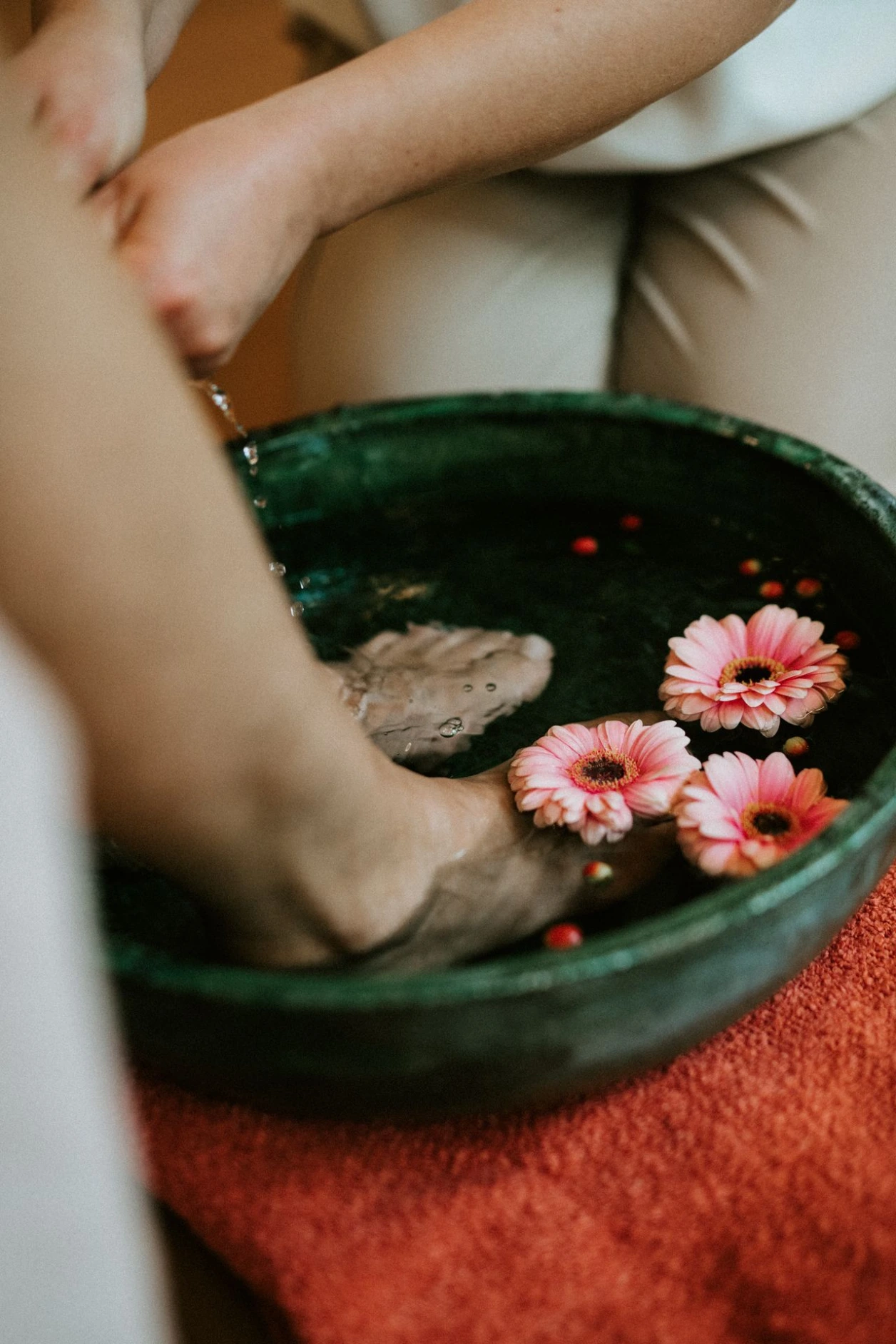 La séance débute par un soin pour dépolluer les pieds. Elle se prolonge avec l’onction – massage des pieds jusqu’aux genoux. 2 grandes huiles essentielles spécifiques accompagnent à des moments choisis